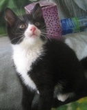 Доброе утро! Итак, этот любопытный чертенок у меня. Аппетит хороший, ходим ровно в лоточек. Любопытство так и прет: все надо изучить, обнюхать. Немного пугливая, но не убегает когда к ней подходишь. Смотрит на тебя своими глазенами, а как только до неё дотрагиваешься сразу же включает моторчик. Маленькое черно-белое чудо!!! |